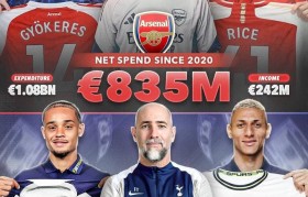 阿森纳与热刺五年引援投入相近,成绩却天壤之别:前者冲冠,后者濒临降级