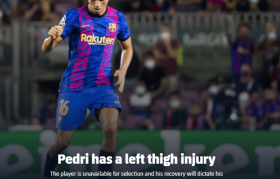 欧冠无缘直接晋级16强,巴萨核心中场佩德里再度受伤,预计缺阵一个月